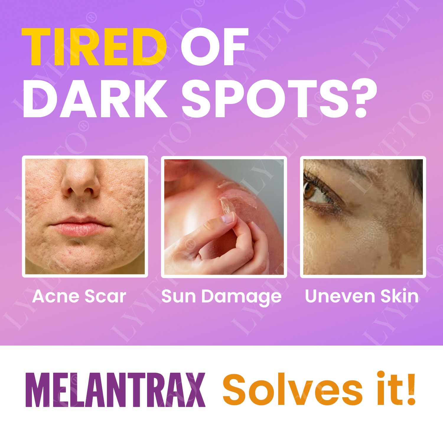 Whether it's stubborn acne scars, sun damage, or uneven skin tone, MelantraX is your answer to clearer, brighter skin. Our advanced formula targets all types of hyperpigmentation at the source, breaking down excess melanin and promoting healthy cell renewal.
